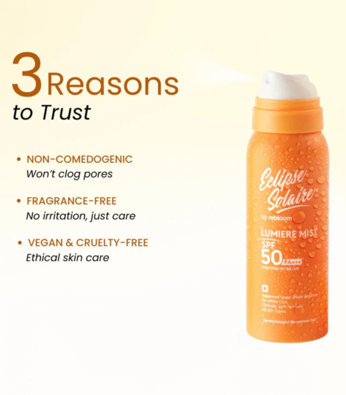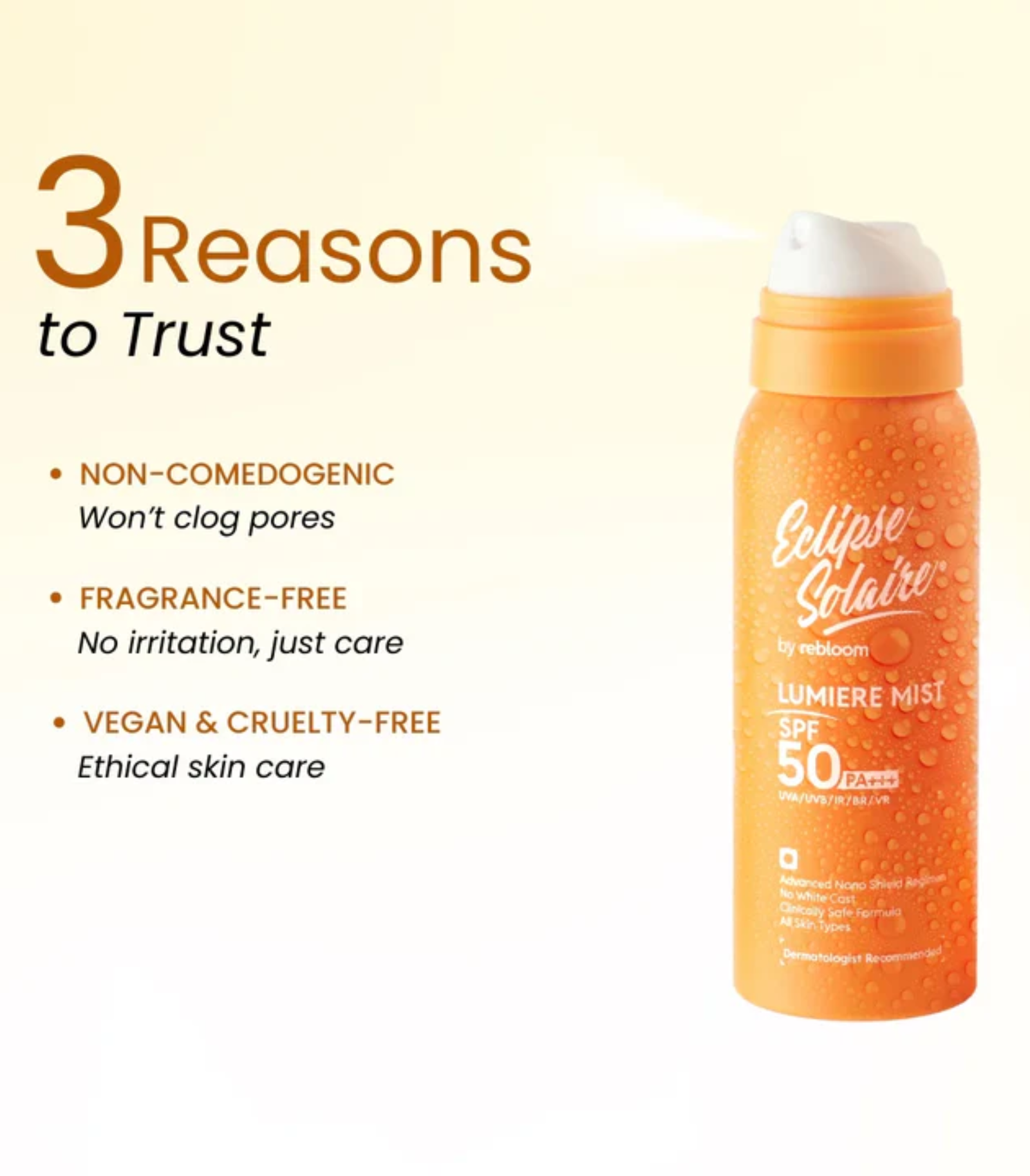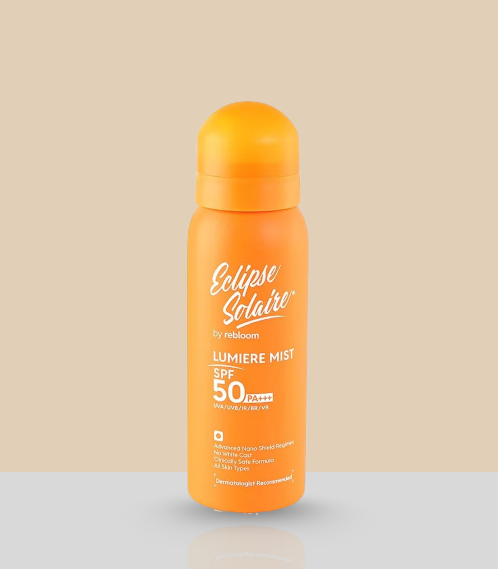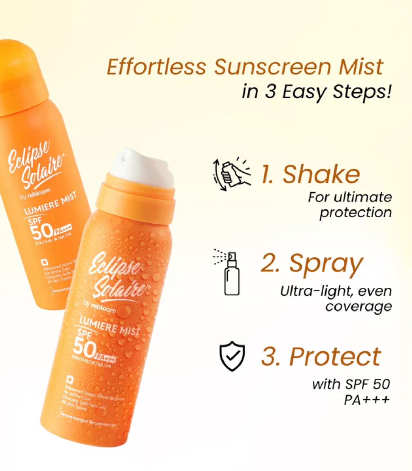 Eclipse Solaire Lumiere Mist Sunscreen Spray SPF 50 PA+++ UVA/ UVB/ IR / BR / VR /No White Cast /All Skin Types | 100ML